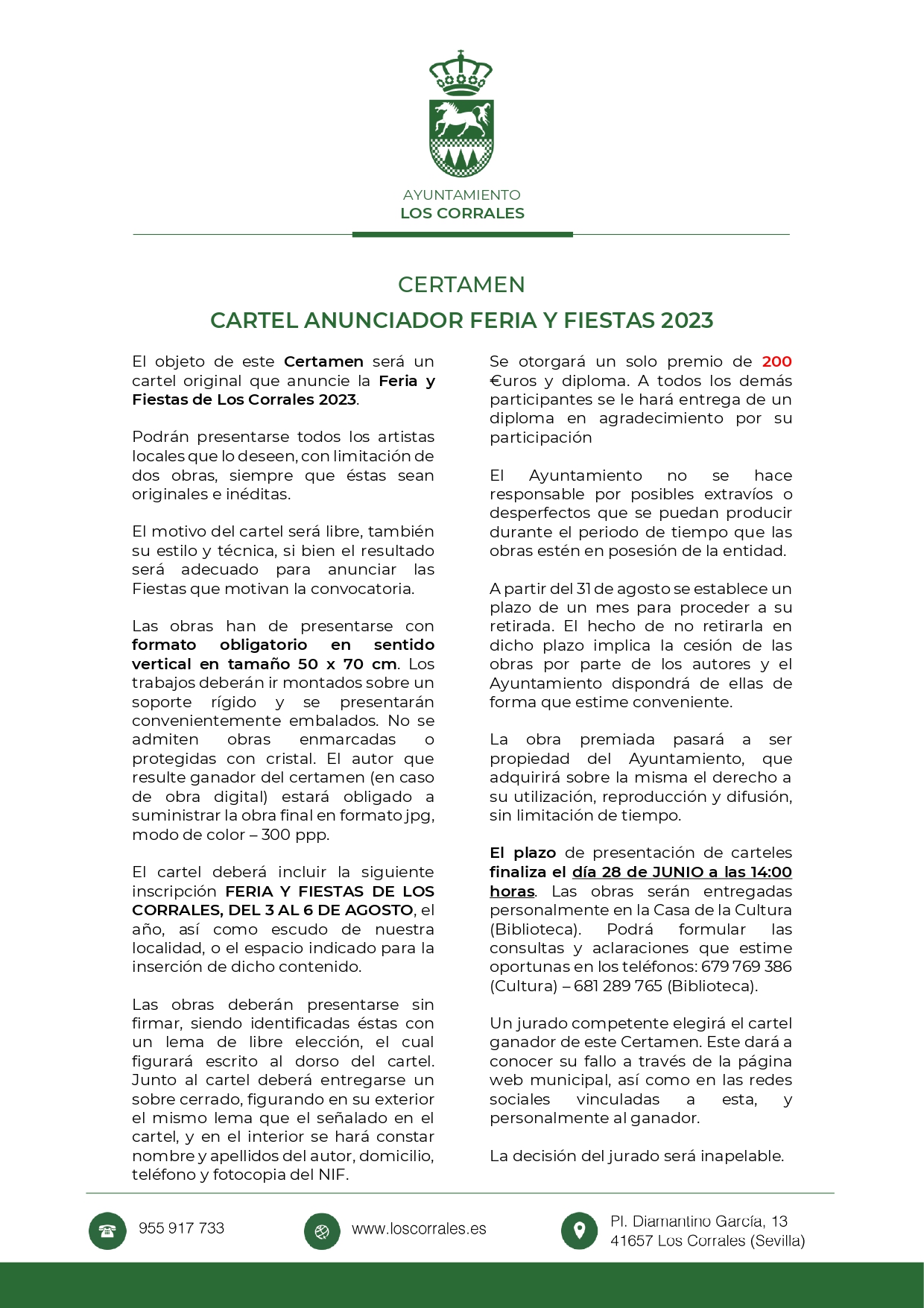 BASES CERTAMEN ELECCIÓN CARTEL ANUNCIADOR FERIA Y FIESTAS 2023 Plazo: Miércoles 28/JUNIO/2023, a las 14:00horas.
