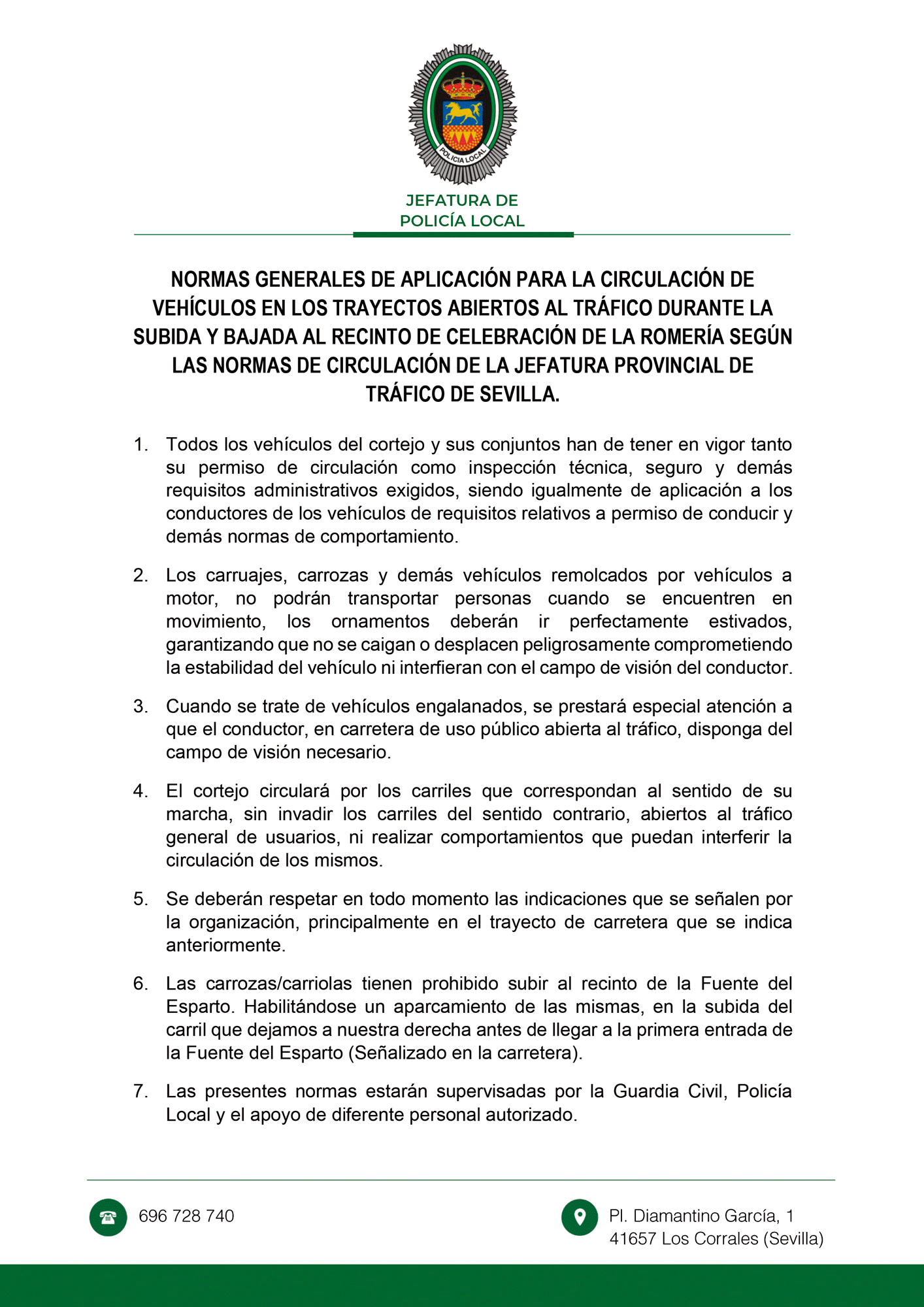 Normas generales de aplicación para la circulación de vehículos en los trayectos abiertos al tráfico durante la subida y bajada al recinto de clebración de la Romería según las normas de circulación de la Jefatura Provincial de Tráfico de Sevilla.