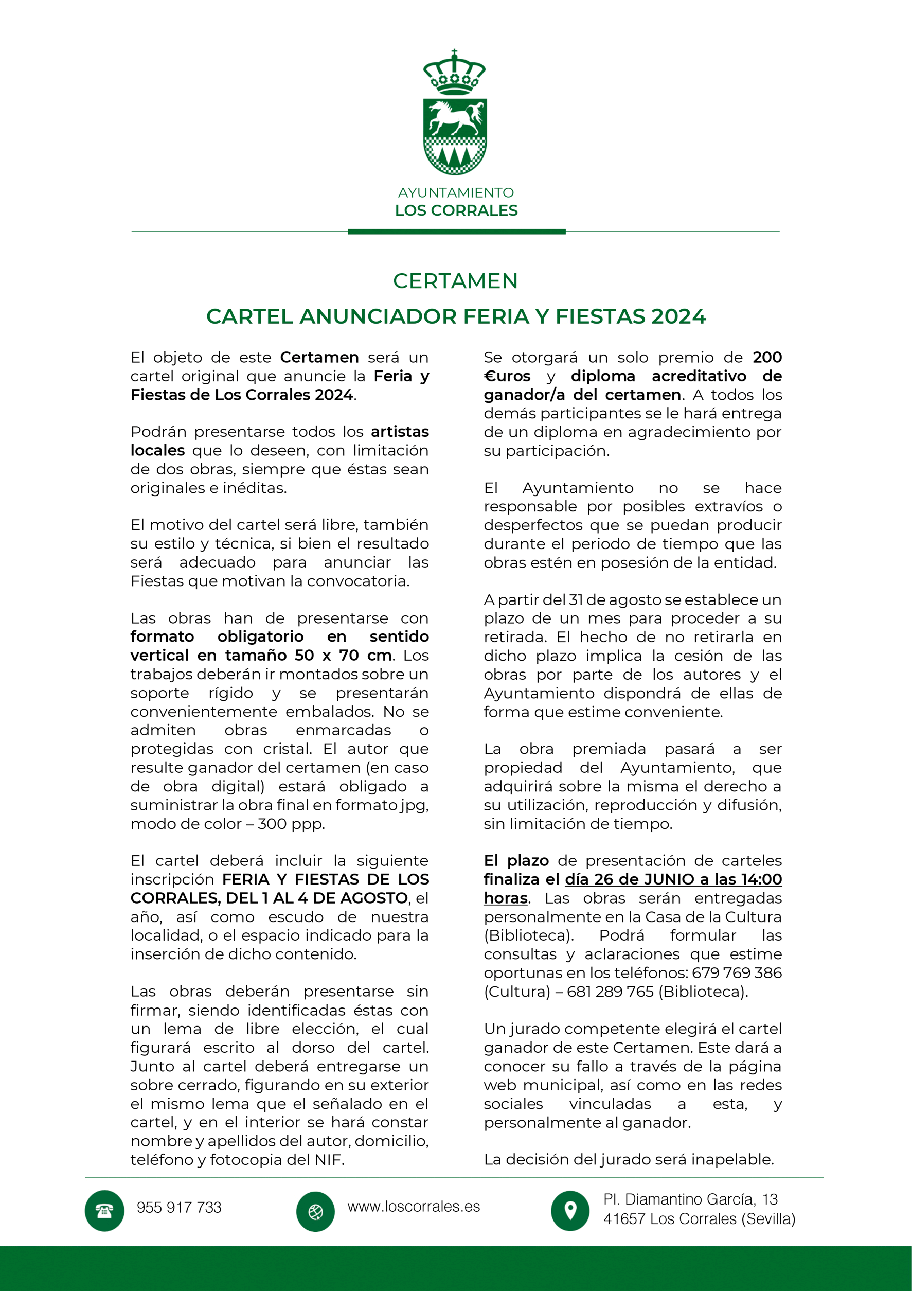 BASES CERTAMEN ELECCIÓN CARTEL ANUNCIADOR FERIA Y FIESTAS 2024 Plazo: Miércoles 26/JUNIO/2024, a las 14:00horas.