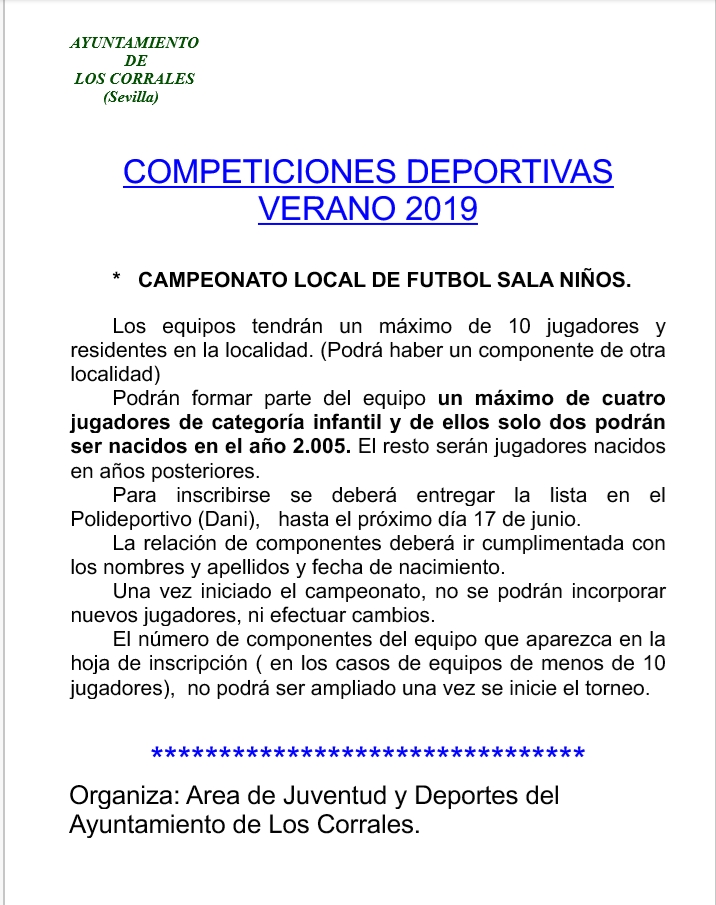 COMPETICIONES DEPORTIVAS VERANO 2019 - CAMPEONATO LOCAL DE FUTBOL SALA JUNIOR