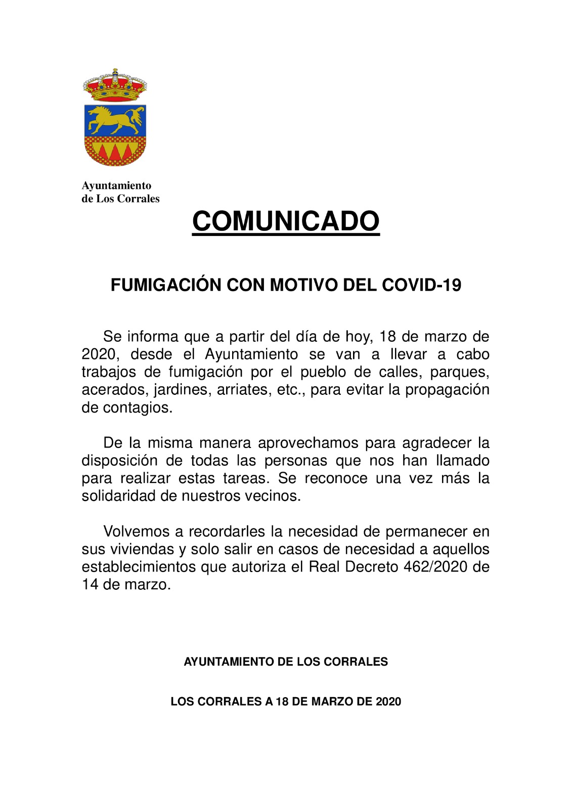COMUNICADO FUMIGACIÓN CON MOTIVO DEL COVID - 19