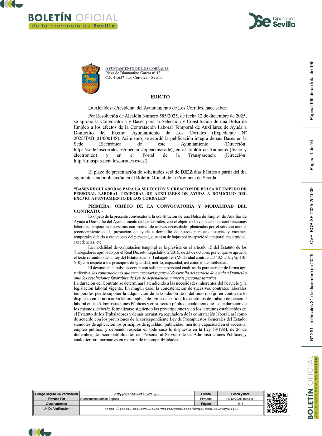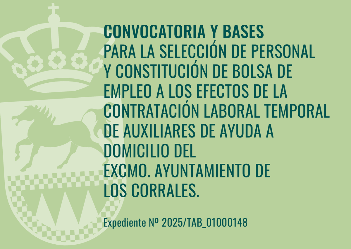 Por Resolución de Alcaldía Número 585/2025, de fecha 12 de diciembre de 2025, se aprobó la Convocatoria y Bases para la Selección y Constitución de una Bolsa de Empleo a los efectos de la Contratación Laboral Temporal de Auxiliares de Ayuda a Domicilio del Excmo. Ayuntamiento de Los Corrales (Expediente Nº 2025/TAB_01/000148). Asimismo, se acordó la publicación íntegra de sus Bases en la Sede Electrónica de este Ayuntamiento (Dirección: https://sede.loscorrales.es/opencms/opencms/sede), en el Tablón de Anuncios (físico y electrónico) y en el Portal de la Transparencia (Dirección: http://transparencia.loscorrales.es/es/).
