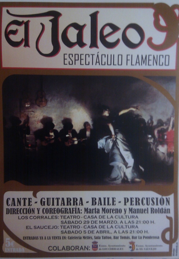 El Jaleo, espectáculo flamenco. Sabado 29 de Marzo a las 21:00 horas en la Casa de La Cultura. Entrada 5 Euros, a la venta en Cafeteria Mélies, Sala Tatoo, Bar Tomás y Bar La Ponderosa..