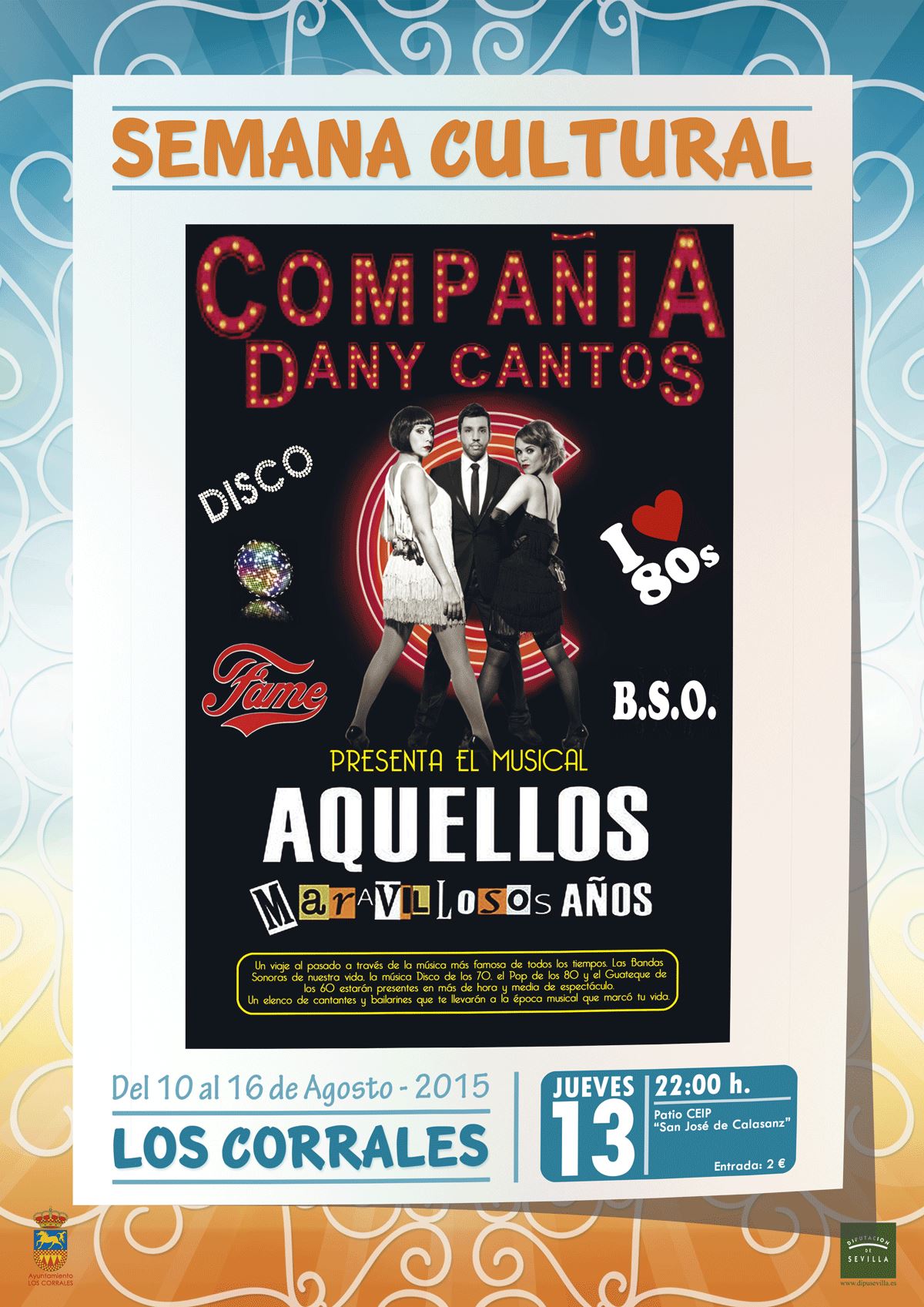 MUSICAL AQUELLOS MARAVILLOSOS AÑOS. A cargo de la compañia Dany Cantos. Jueves 13 de Agosto a las 22:00 h en el patio del colegio; CEIP SAN JOSE DE CALASANZ. Entrada 2 euros.