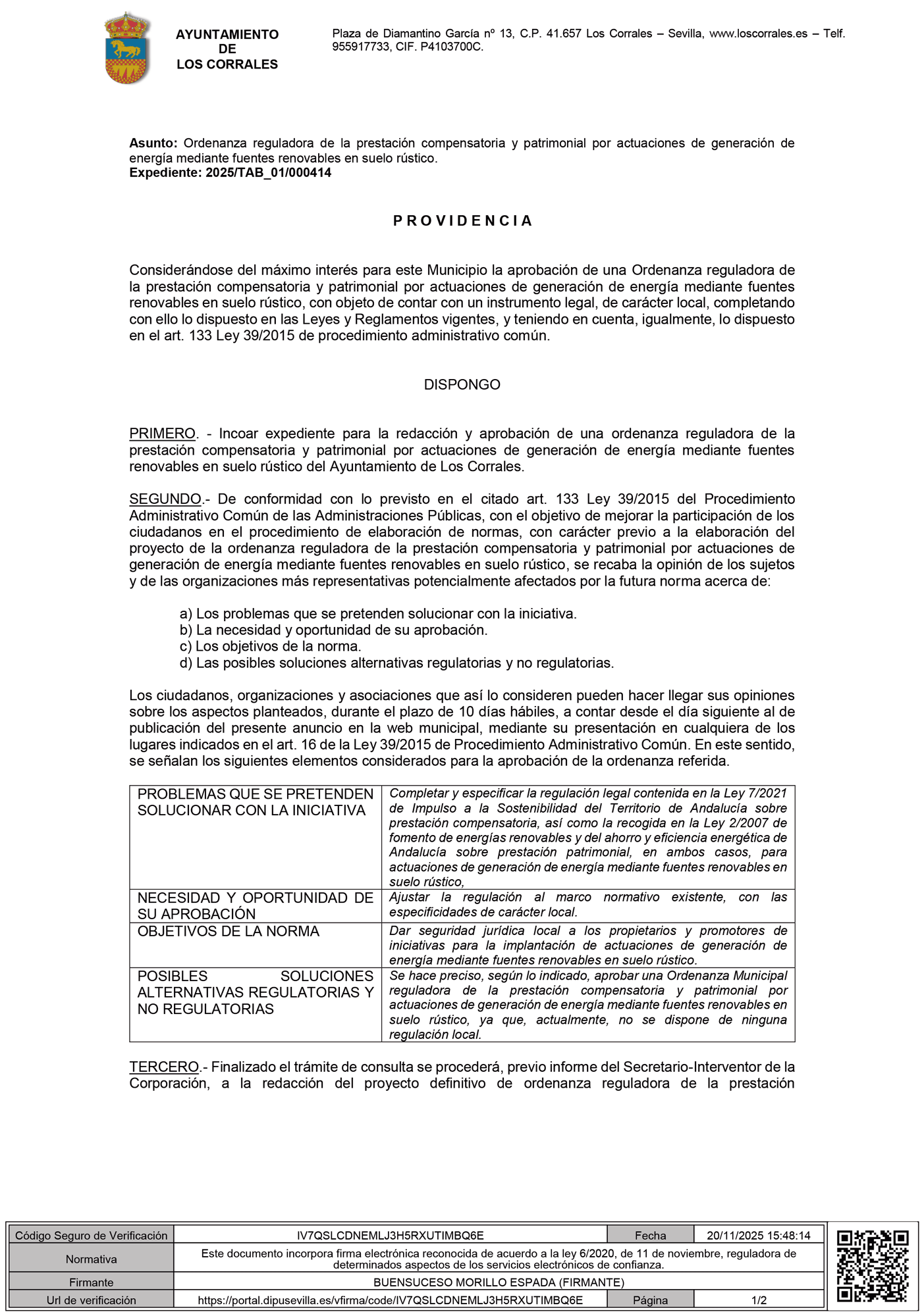 Considerándose del máximo interés para este Municipio la aprobación de una Ordenanza reguladora de la prestación compensatoria y patrimonial por actuaciones de generación de energía mediante fuentes renovables en suelo rústico, con objeto de contar con un instrumento legal, de carácter local, completando con ello lo dispuesto en las Leyes y Reglamentos vigentes, y teniendo en cuenta, igualmente, lo dispuesto en el art. 133 Ley 39/2015 de procedimiento administrativo común.