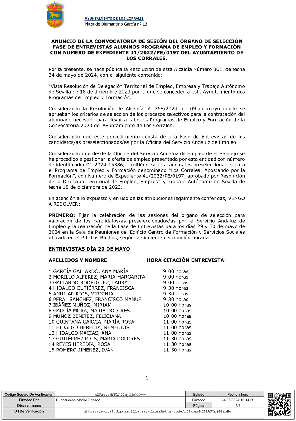 Considerando que desde la Oficina del Servicio Andaluz de Empleo de El Saucejo se ha procedido a gestionar la oferta de empleo presentada por esta entidad con número de identificador 01-2024-15386, remitiéndose los candidatos preseleccionados para el Programa de Empleo y Formación denominado “Los Corrales: Apostando por la Formación”, con Número de Expediente 41/2022/PE/0197, aprobado por Resolución de la Dirección Territorial de Empleo, Empresa y Trabajo Autónomo de Sevilla de fecha 18 de diciembre de 2023.