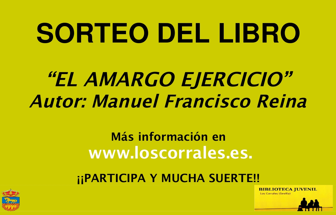 Si eres socio de la Biblioteca Municipal, puedes participar en el Sorteo del libro "EL AMARGO EJERCICIO". Autor Manuel Francisco Reina, solo tienes que pinchar en el enlace que aparece al final de esta página, contestar correctamente a las preguntas que te hacemos relacionadas con los libros, facilitarnos tus datos de contacto,y ya tienes la posibilidad de conseguir un mágnifico libro (solo se admite una participación por persona).