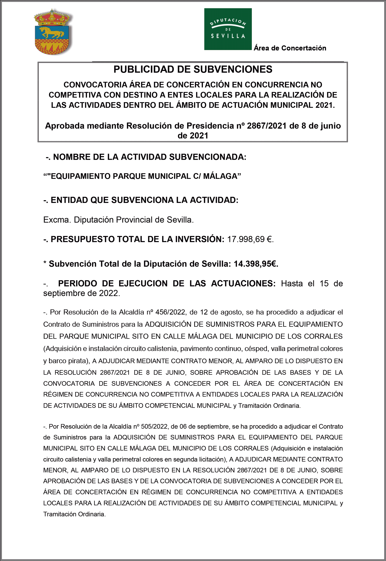 NOMBRE DE LA ACTIVIDAD SUBVENCIONADA: “"EQUIPAMIENTO PARQUE MUNICIPAL C/ MÁLAGA”