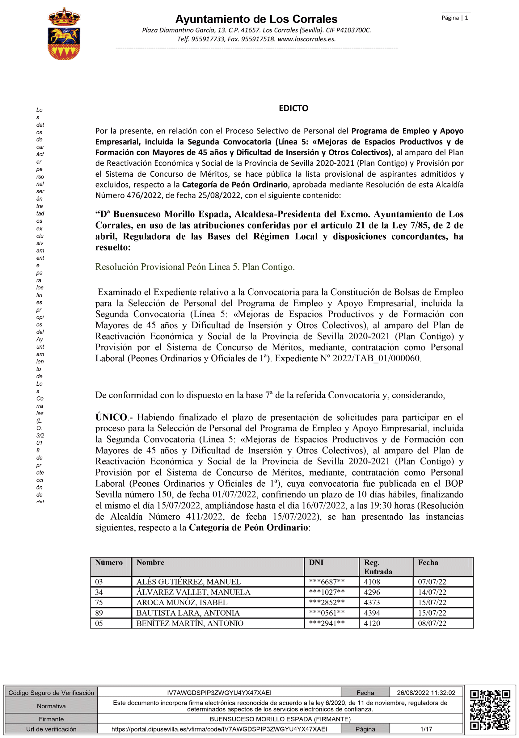 Se hace pública la lista provisional de aspirante admitidos y excluidos, respecto a la Categoría de PEÓN ORDINARIO.