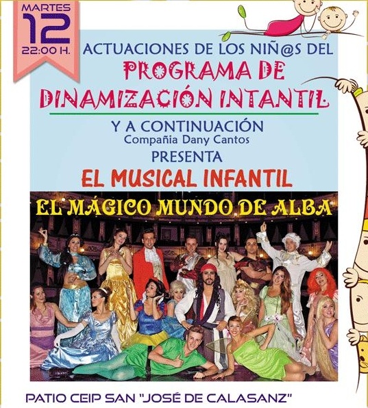 ACTUACIONES DE LOS NIÑ@S DEL PDI Y EL MUSICAL INFANTIL: EL MAGICO MUNDO DE ALBA. 12 de Agosto a las 22:00 horas en el patio del CEIP San José de Calasanz.