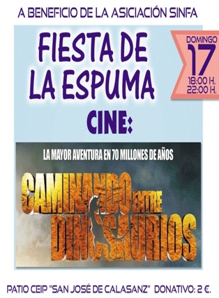 FIESTA DE LA ESPUMA Y CINE: CAMINANDO ENTRE DINOSAURIOS. A beneficio de SINFA. 17 de Agosto a las 18:00 h y 22:00 h respectivamente en el patio del CEIP San José de Calasanz.