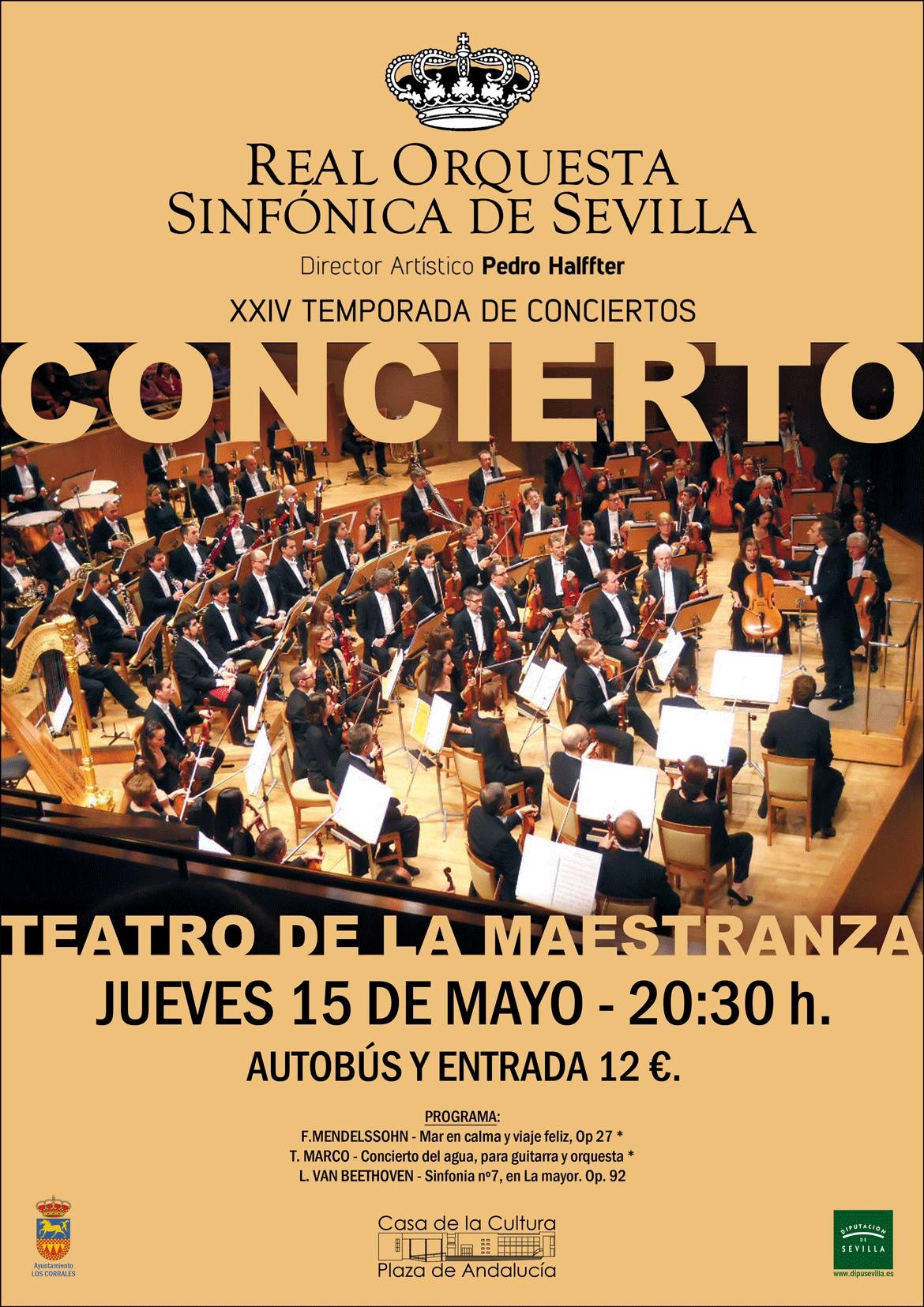 CONCIERTO DE LA REAL ORQUESTA SINFÓNICA DE SEVILLA. Jueves 15 de Mayo a las 20:30h. Precio 12 Euros (Entrada + autobus). Lugar de inscripción Casa de la Cultura.