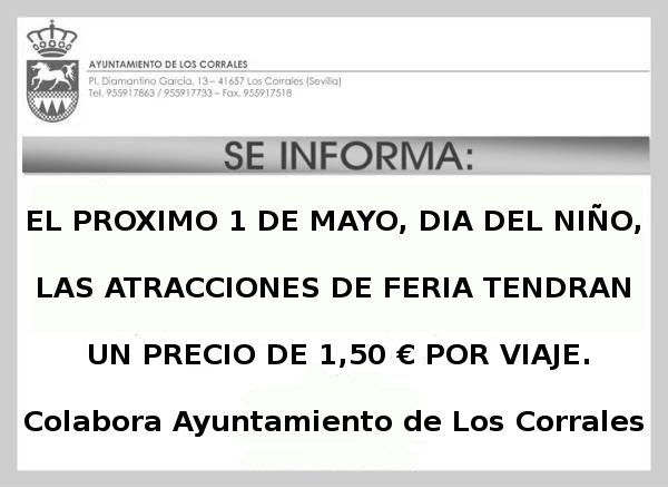 El próximo 1 de Mayo, DIA DEL NIÑO, las atracciones de feria tendrán un precio de 1,50 Euros por viaje. Colabora Ayuntamiento de Los Corrales.