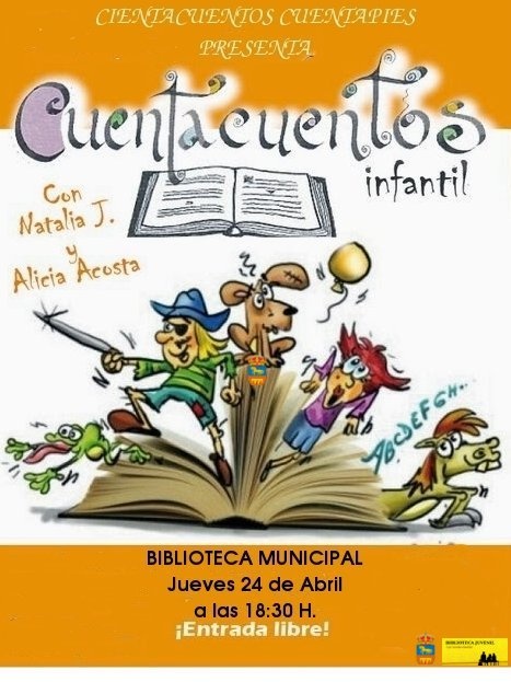El próximo 24 de Abril a las 18:30h en la Biblioteca Municipal tendrá lugar una sesión de cuentacuentos a cargo del grupo teatral Cientacuentos Cuentapies. Entrada Gratuita.