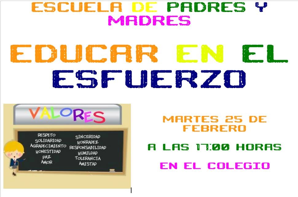 ESCUELA DE PADRES Y MADRES. Educar en el esfuerzo. Martes 25 de Febrero a las 17:00h en el colegio.